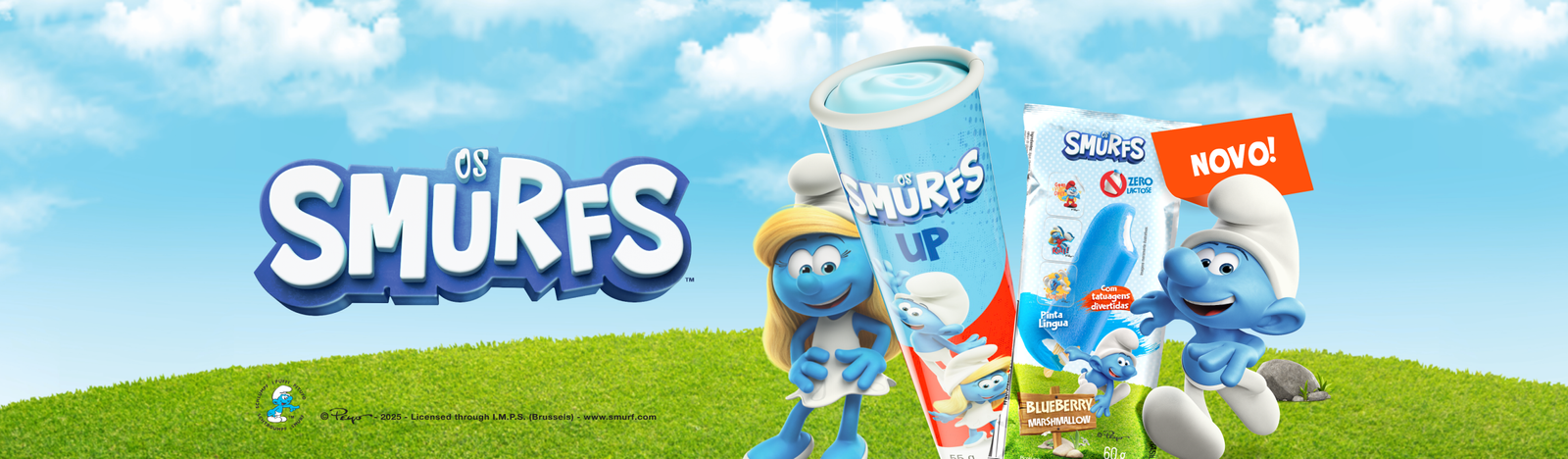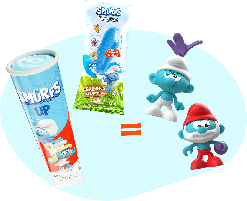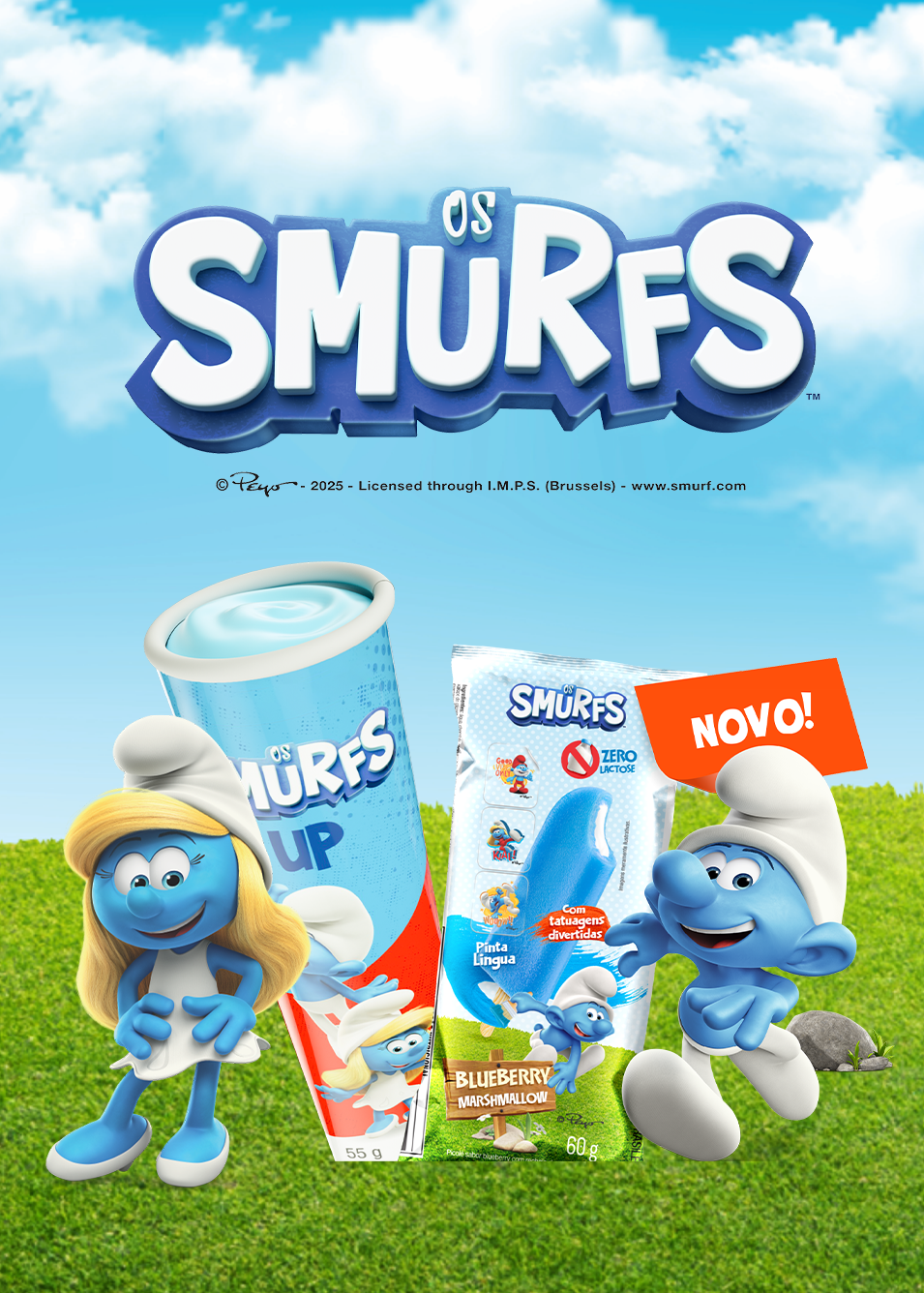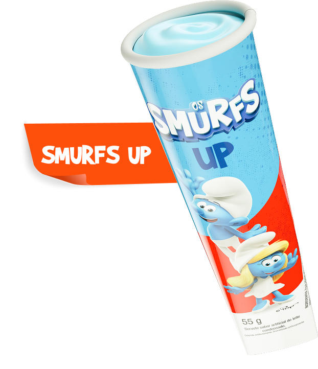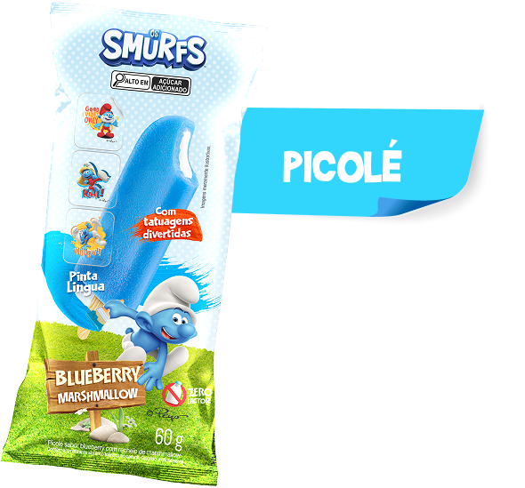 O Picolé Smurfs traz o sabor do blueberry com recheio cremoso de marshmallow, pinta a língua e ainda vem com tatuagens exclusivas dos Smurfs para colecionar. Diversão garantida para as crianças!