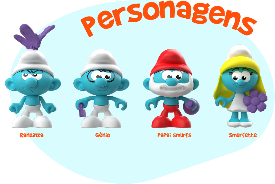 Personagens disponíveis: Selecionamos personagens variados e que conquistam o coração do público! São 4 personagens dos Smurfs disponíveis: Smurfette, Smurf Gênio, Papai Smurf e Smurf Ranzinza.